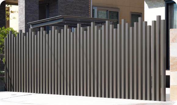 外部から家の中が見えないよう目隠しのためにフェンスを付けられる方が多い様です。素材は門扉同様アルミや木製、アルミ+樹脂などのほか、植栽を巡らす生け垣やブロック塀、土壁などがあります。フェンスを付けるだけで家が立派に見えるという不思議な効果もあります。