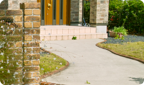 アプローチとは門扉から玄関まで続く通路のこと。素材はコンクリートやインターロッキング、タイル、レンガなどが一般的です。どんな所からも雑草は生えてくるものですが、しっかりと施工することで今後の苦労が飛躍的に軽減されます。